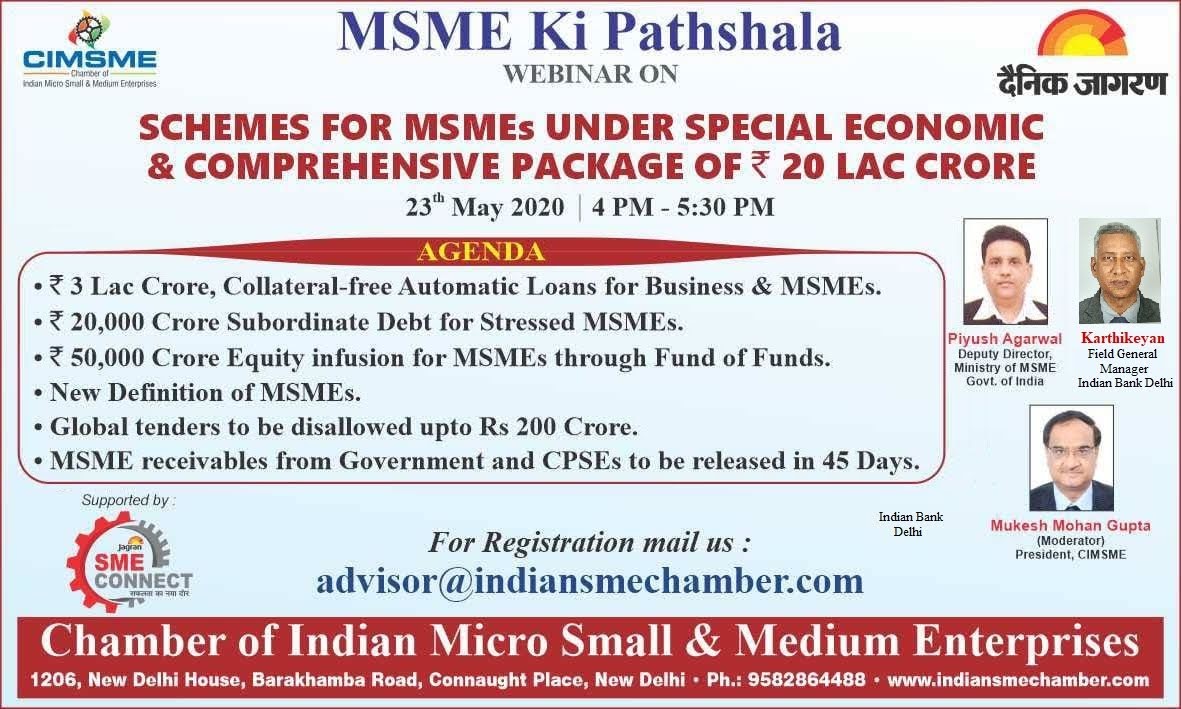This is a video of the webinar on Schemes for the MSMEs under Special Economic and Comprehensive Package of Rs. 20 lakh Crores which was organized by Chamber of Indian Micro Small and Medium Enterprises in association with Dainik Jagran on May 23, 2020 at 4.00 PM. The Agenda for the above Webinar was to discuss and explain all features of the below announcement under Special Economic and Comprehensive Package of Rs 20 lakh crores, equivalent to 10% of India’s GDP: