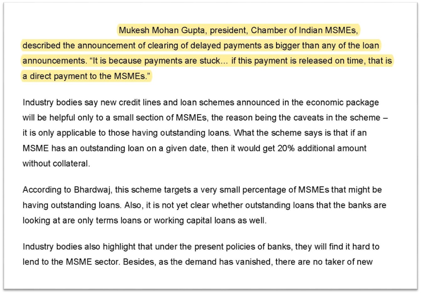 https://www.financialexpress.com/industry/covid-crisis-msmes-pin-hopes-on-release-of-payments-by-govt/1966779/#:~:text=In%20dire%20need%20of%20cash,or%20payments%20towards%20electricity%20bills.&text=%E2%80%9CIt%20is%20because%20payments%20are,direct%20payment%20to%20the%20MSMEs.%E2%80%9D